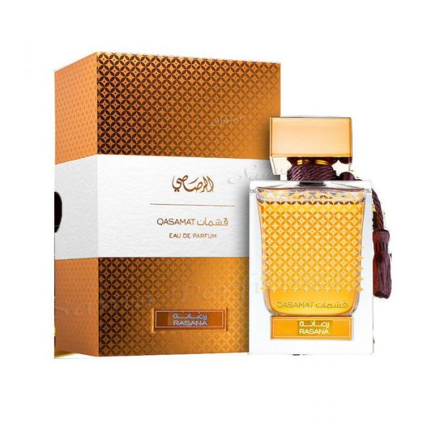 Rasasi Qasamat Rasana a perfume water for men and women Top notes: Apple, Bergamot, Lemon. Heart notes: Sandalwood, Leather, Cypriol Essential Oil. Background notes: Oud, Amber, Cedar, Musk.